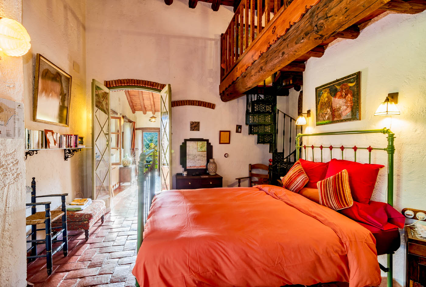 Dormitorio 1: cama doble con escalera de caracol hasta una galería;