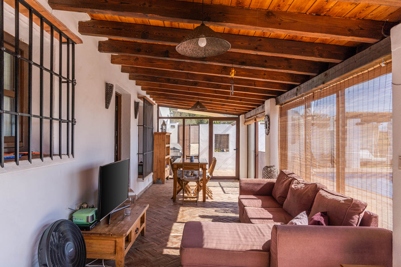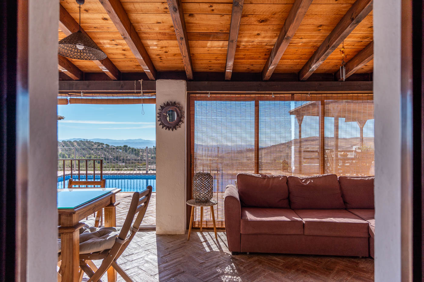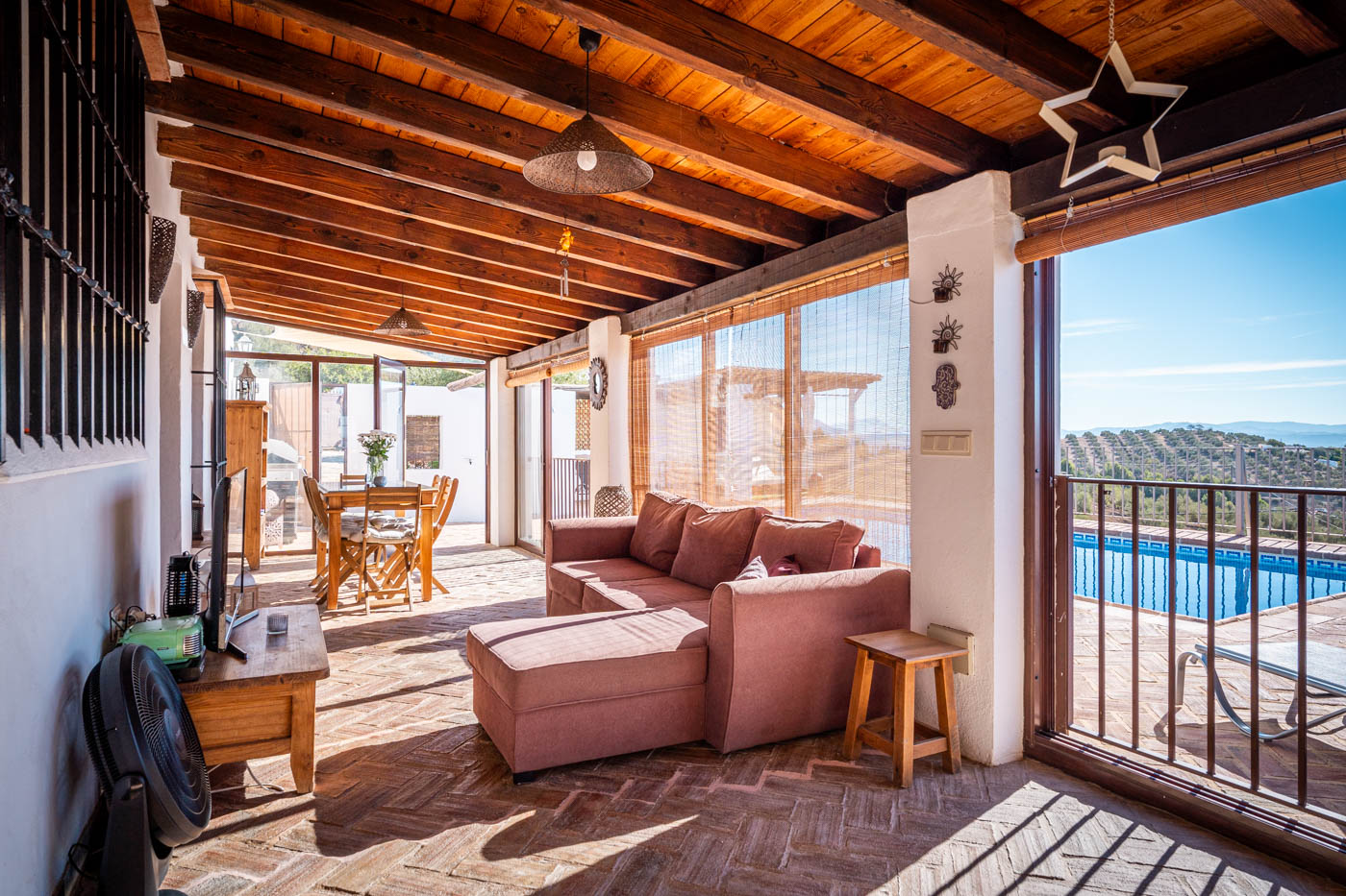 Esa sala es acogedora y es el salón acristalado con vistas a la piscina el que más se utiliza para comer o ver la televisión. Las ventanas disponen de persianas.