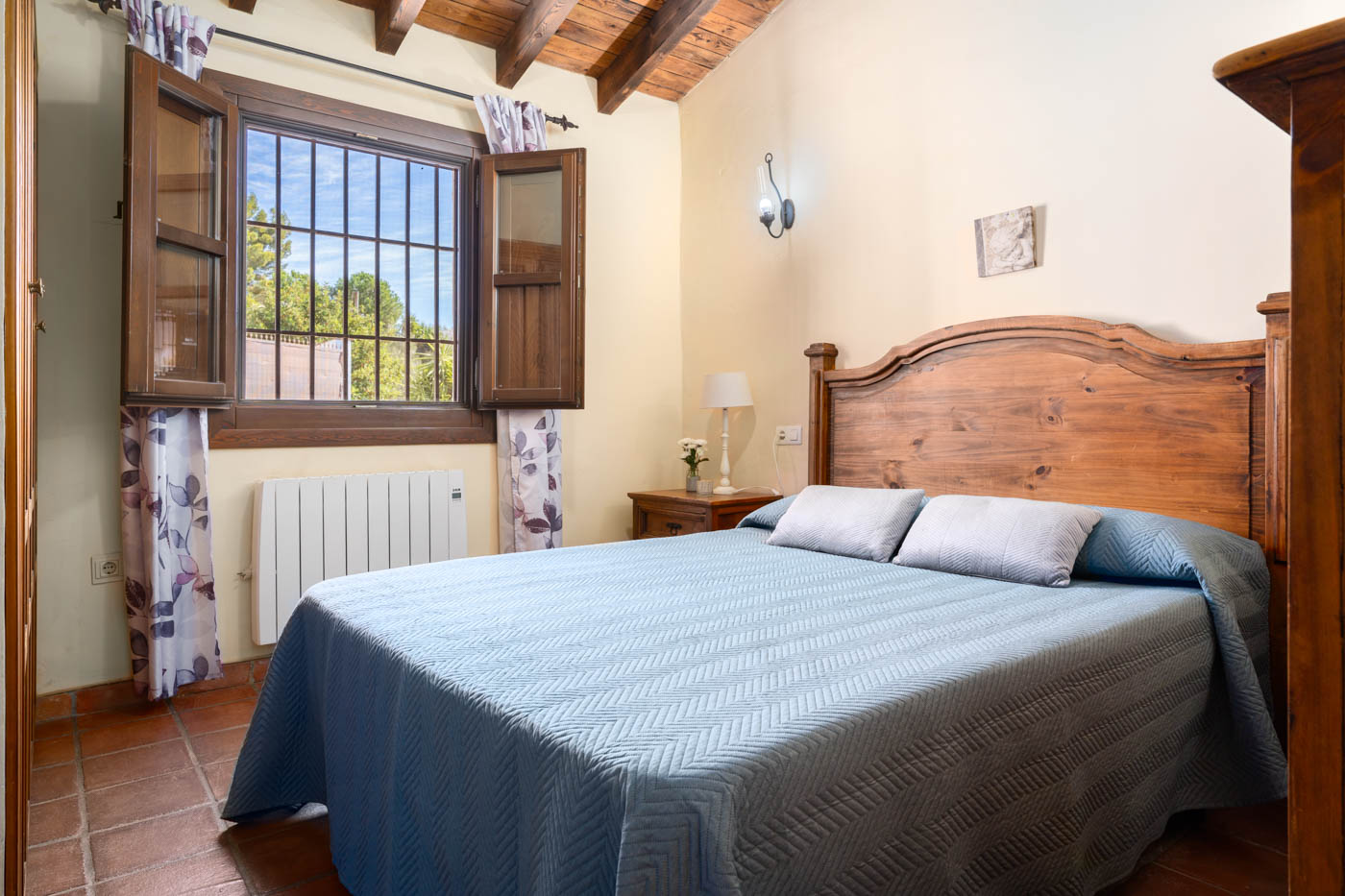Hay tres dormitorios, con mosquiteras, persianas, cortinas, armarios y lámparas de noche.
