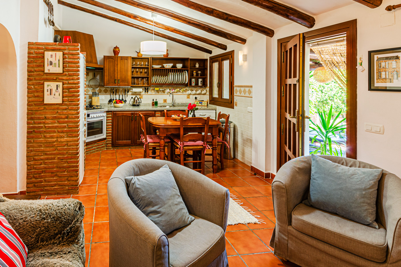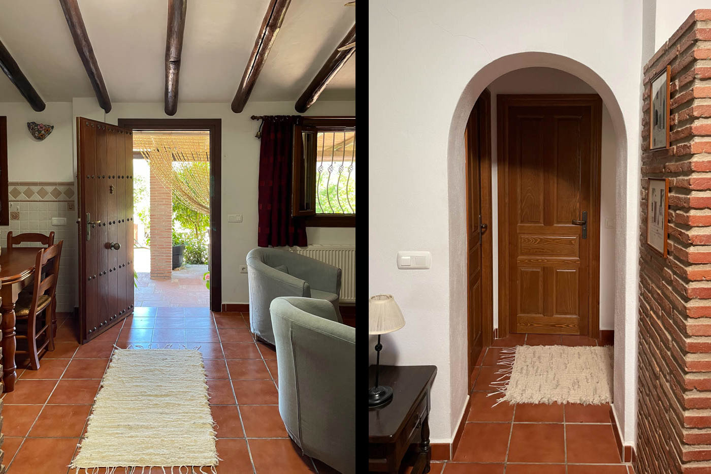 El interior de la casa es sencillo pero funcional y ciertamente adecuado para unas vacaciones rurales, con sus características vigas de madera y suelos de terracota.
