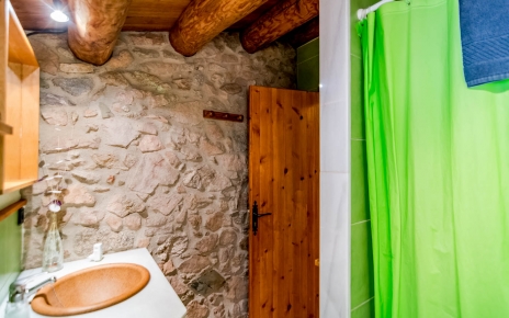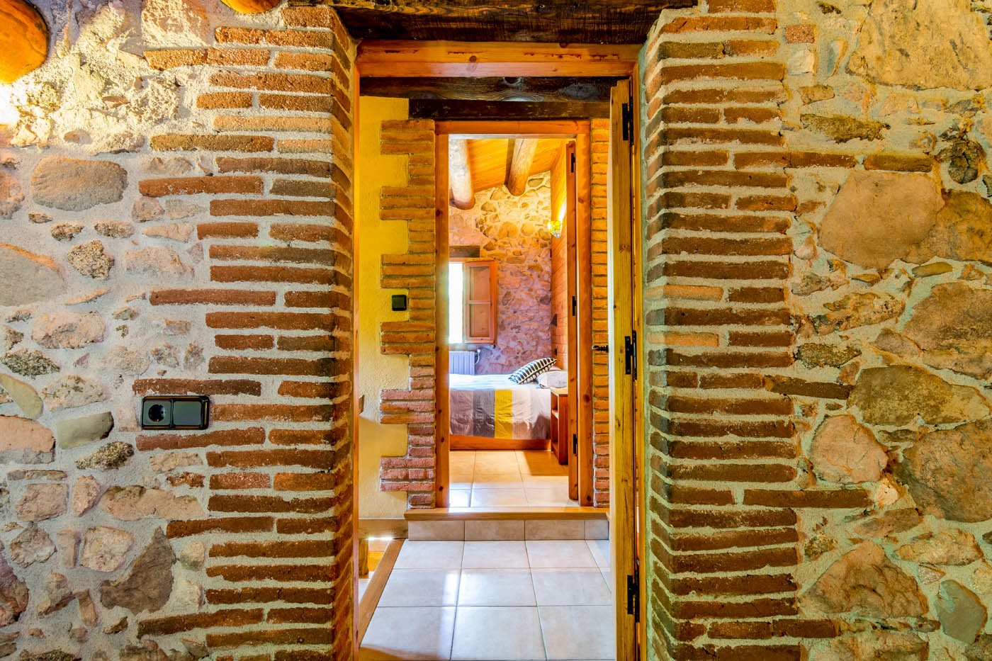 Una escalera asciende a uno de los dormitorios, que es particularmente privado por tener un acceso directo. El techo de madera y las paredes de piedra crean una atmósfera natural. Hay árboles en la parte de atrás y el sonido del arroyo se escucha con la ventana abierta. La otra escalera lleva a las otras tres habitaciones.