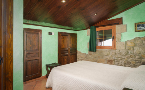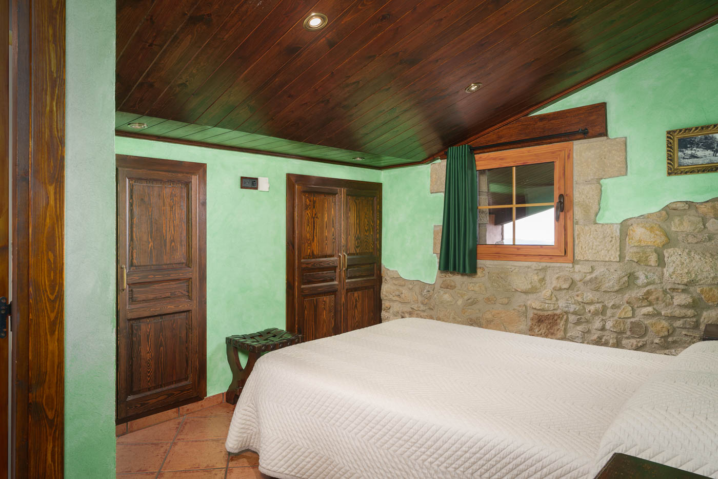 The covered outdoor dining terrace also seats 16 people comfortably. It’s invariably the preferred spot for meals, accompanied by views far and wide. Across the plains you can make out the famed mountainous Natural Parks of Montserrat and Montseny, beckoning you to visit at some point during your stay. Two bedrooms lead off. Both bedrooms look out to the football pitch and gardens.